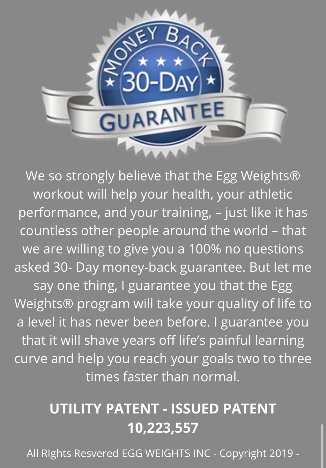 Egg Weights are scientifically proven to increase the intensity of any movement from 28% to 62% with less injury and stress to your muscles and joints.